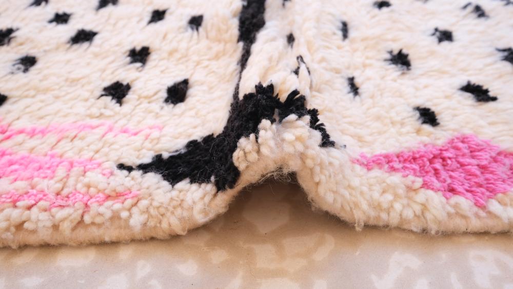 Transform your space with the charm and craftsmanship of this authentic Moroccan Azilal rug. Hand-knotted by skilled artisans using traditional techniques, this exquisite rug blends 100% sheep wool and cotton for unmatched softness and durability. Featuring a stunning abstract design in pink and black, it’s the perfect accent piece to add a touch of modern bohemian flair to any room.